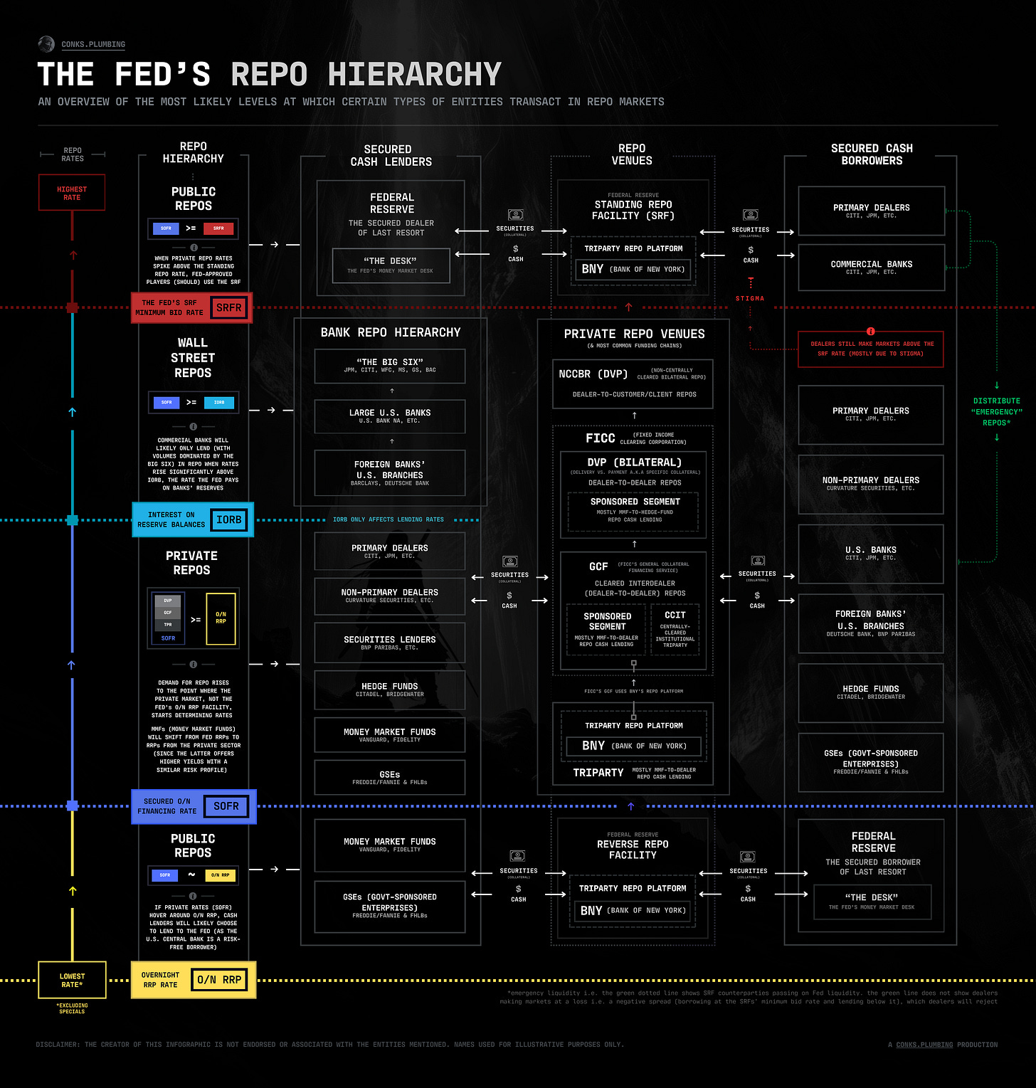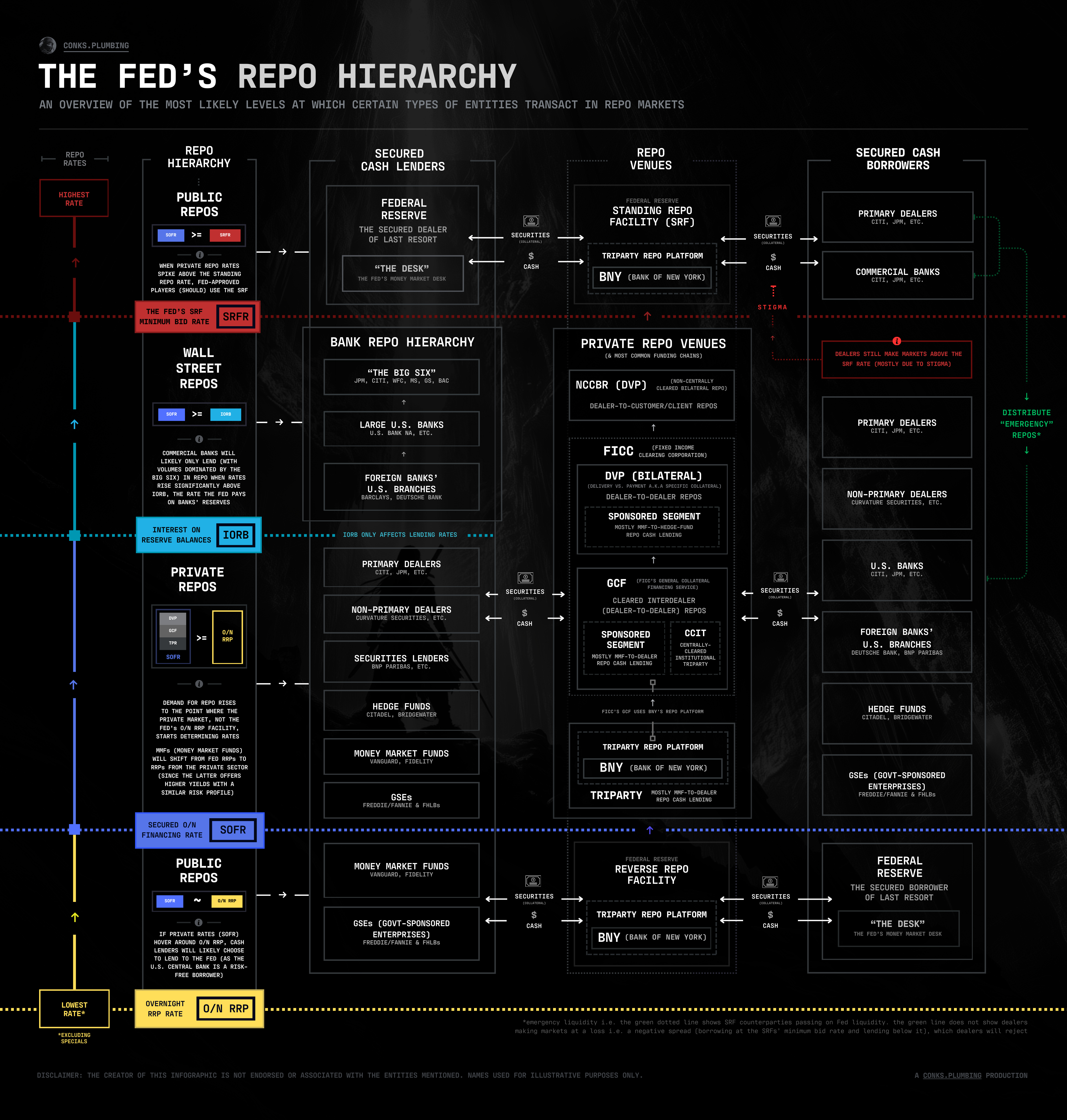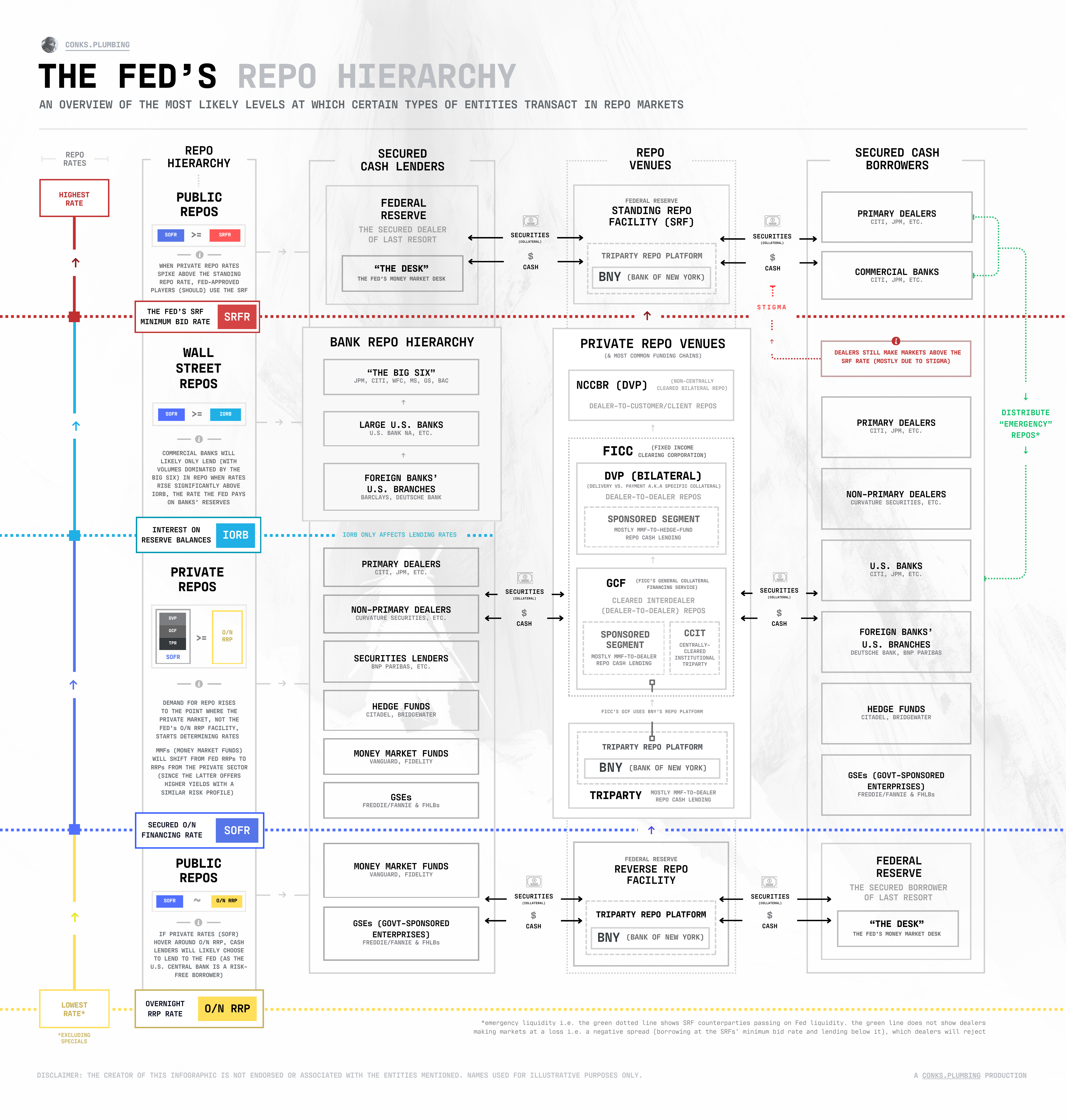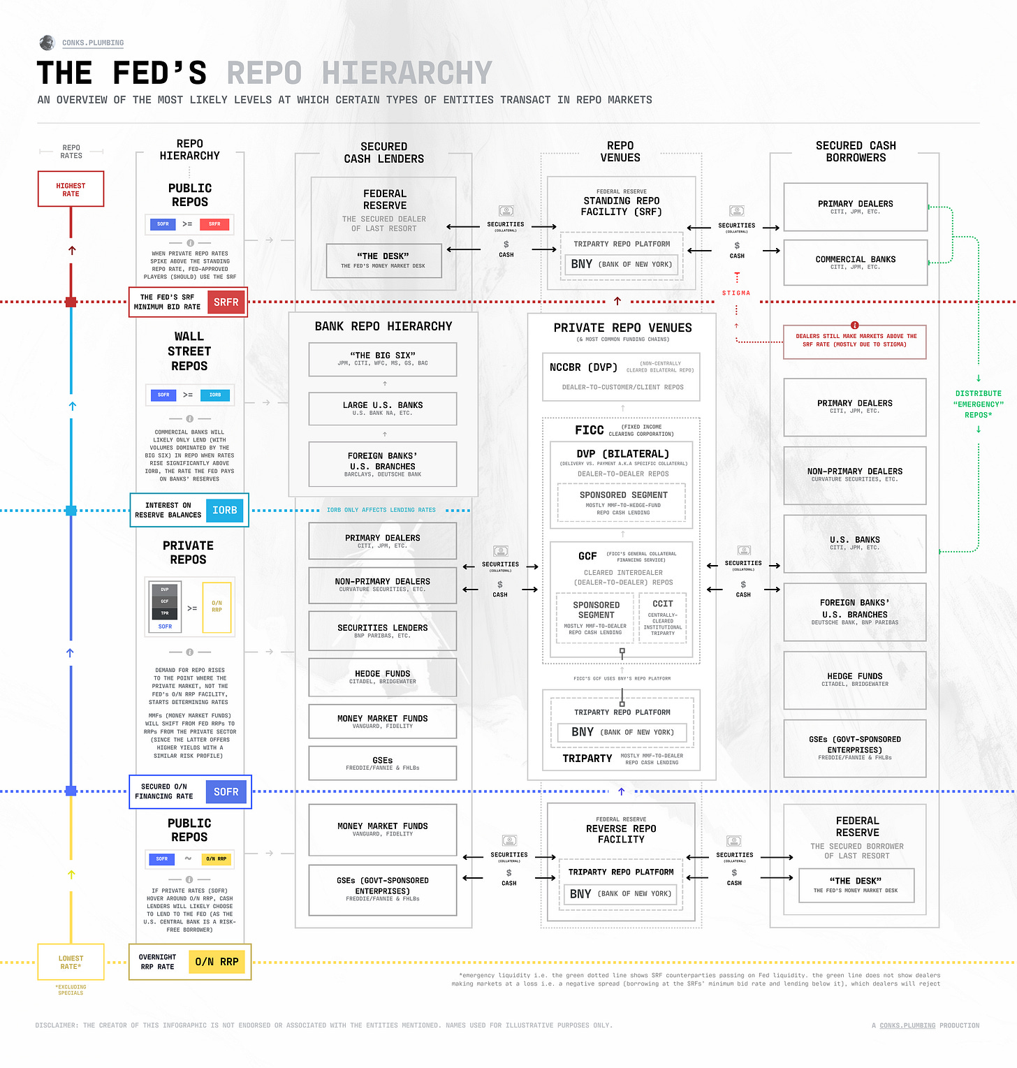 InfographicsInfographics: The Fed's Repo Hierarchyan overview of the hierarchy at which certain types of entities transact in repo marketsConksSep 04, 20254514Share— created as part of The Fed’s Reckoning (upcoming)— related: repo primer series