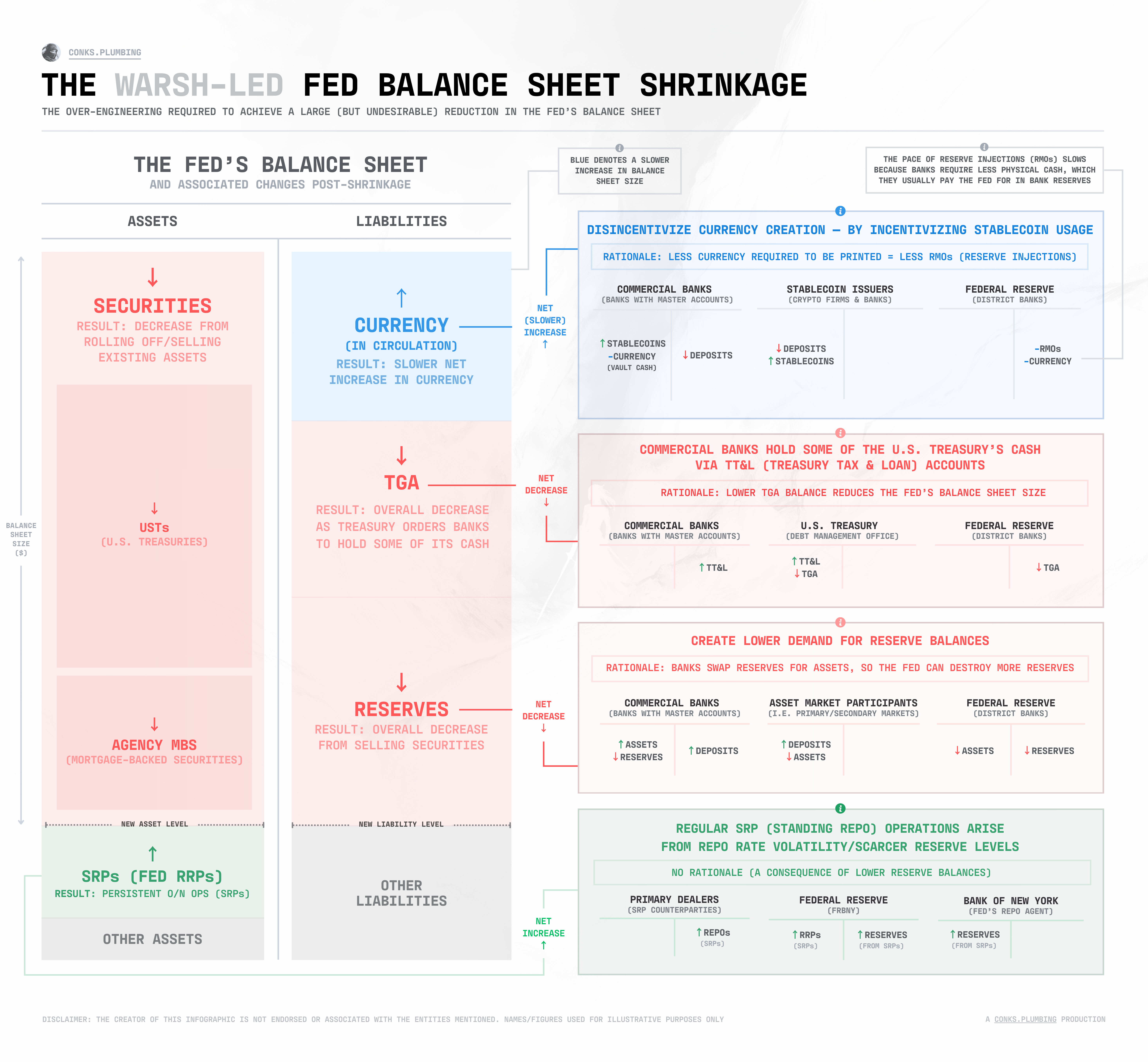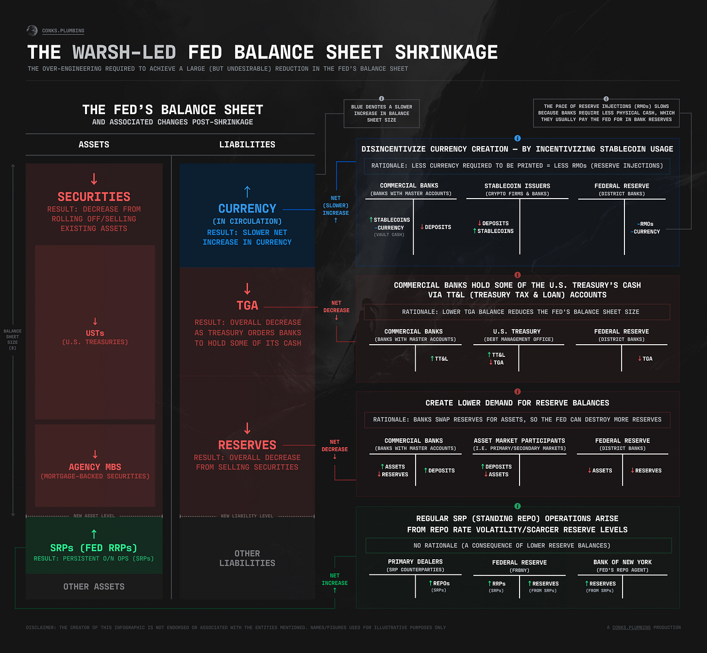 InfographicsInfographics: A Warsh-Led Fed Balance Sheet Reductionan overview of the flows & steps involved in reducing the Fed's balance sheet (with desirable but mostly undesirable outcomes)ConksMar 19, 2026362Share— created as part of The Warsh Ultimatum (upcoming)