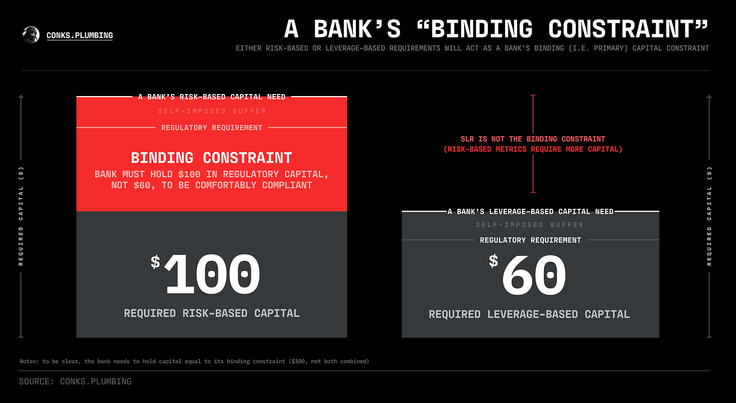For instance, if a bank’s assets require $100 in capital to satisfy RWAs and $60 to meet the SLR, it must hold only $100, not $160. The coming SLR “ease” will ensure that risk-weighted assets become the binding constraint for all large banks.