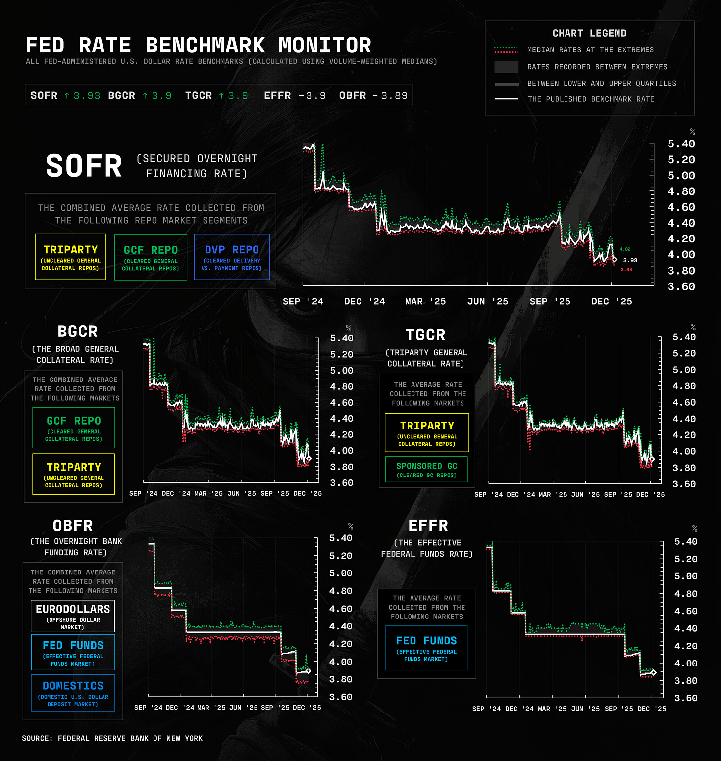 EFFR, OBFR, SOFR, TGCR, and BGCR are subject to the Terms of Use posted at newyorkfed.org. The New York Fed is not responsible for publication of tri-party data from the Bank of New York Mellon (BNYM) or GCF Repo/Delivery-versus-Payment (DVP) repo data via DTCC Solutions LLC (“Solutions”), an affiliate of The Depository Trust & Clearing Corporation, & OFR, does not sanction or endorse any particular republication, and has no liability for your use.