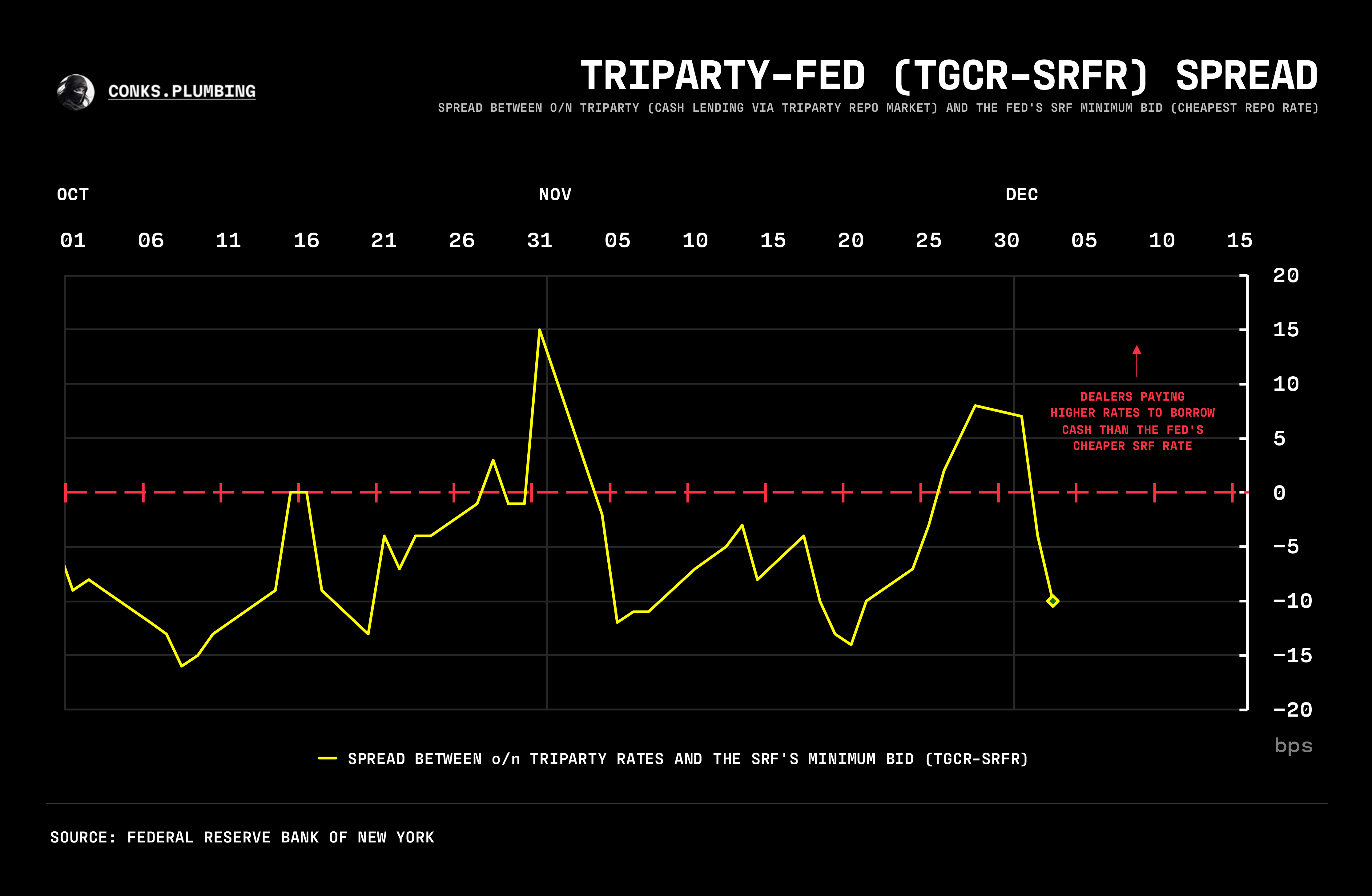 Still, bank balance sheets will be in much better shape to absorb a flood of short-term issuance, with winter concluding post-year-end. Now that November month-end has passed, o/n rates should briefly return to their regular sweet spot between SRFR (the SRF’s minimum bid) and IORB. But it’s the calm before the storm. Much to Conks’ dismay, the balance sheet winter is still in session. Some banks now project the Fed will signal its intention to expand its balance sheet as early as the Dec FOMC meeting, with RMOs beginning sometime in late January. Nonetheless, that won’t stop any immediate stormy weather, with no assistance likely to emerge at the incoming FOMC presser. The Triparty-Fed Spread (TGCR-SRFR) shows dealers are only paying a truly irrational rate on month-ends, when logic is known to fly out the window. In an era of excess collateral, rate spikes above the SRF are now commonplace at both mid-month and month-end — at least until liquidity injections begin.