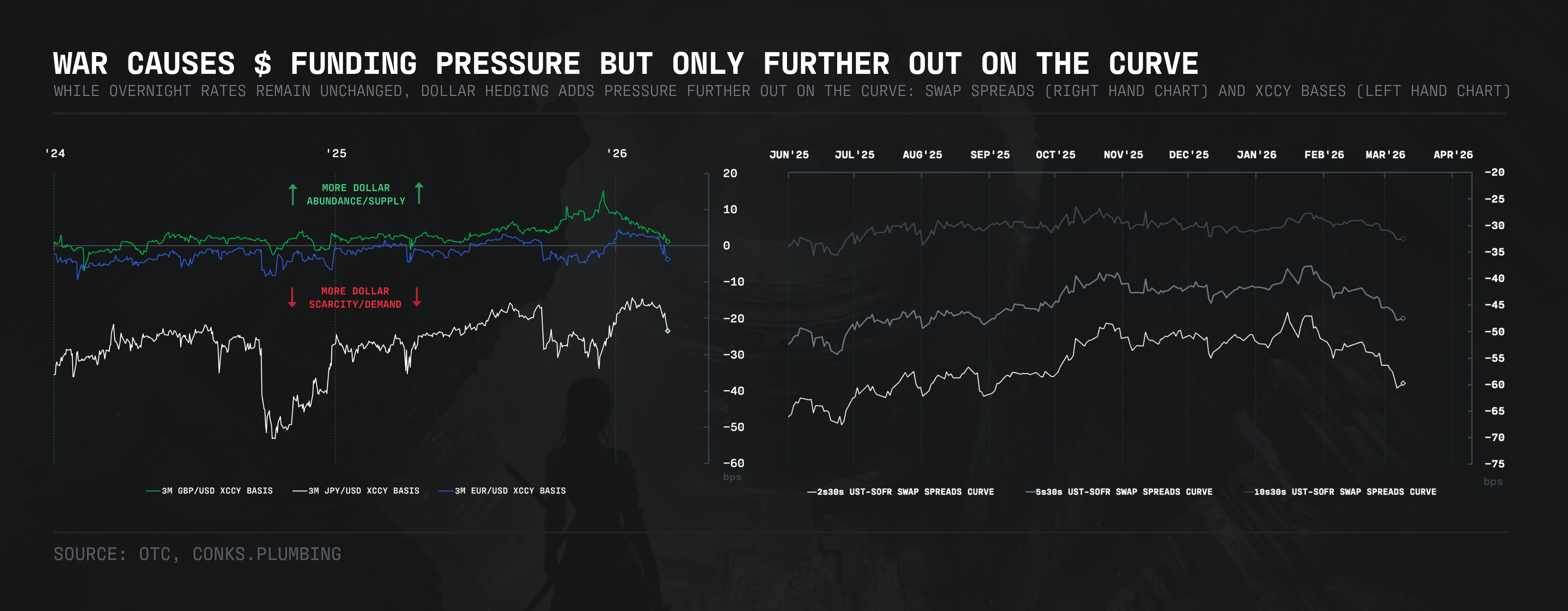 The Middle Eastern “Not War”1 is creating fragmentation in dollar funding markets. Onshore, conditions remain lax. Money funds have received hefty flight-to-safety inflows, pressuring bill yields and o/n (overnight) rates lower. Offshore, meanwhile, an unwind of low volatility and increased demand for dollar hedging have pressured cross-currency bases wider2. A return to a Global Compression where onshore and offshore $ rates converge will thus only materialize when the Board of Peace earns its title. The duration of the Not War, whether TACOed (i.e. short) or prolonged, has now become key to where dollar funding and rates markets trade.