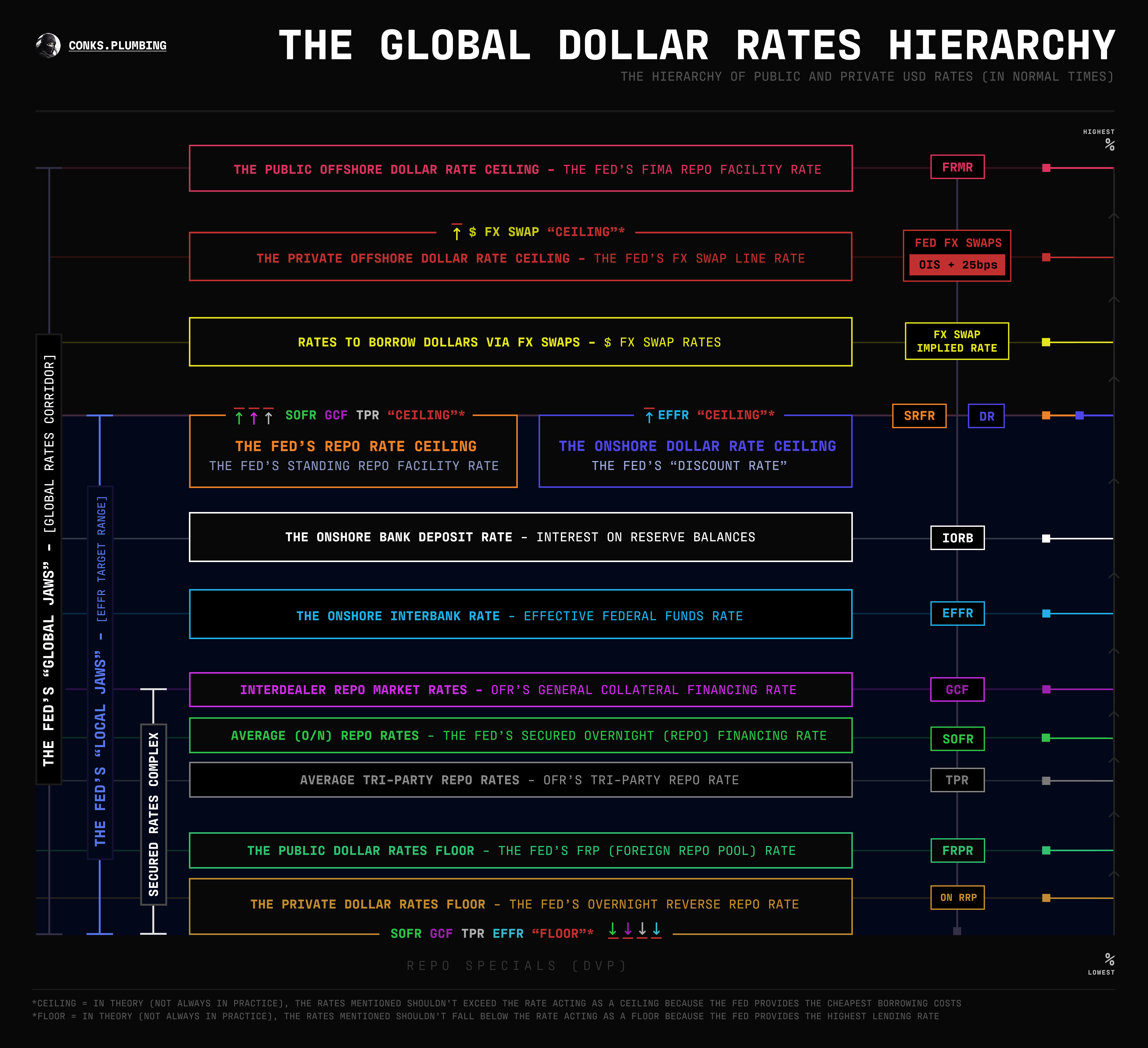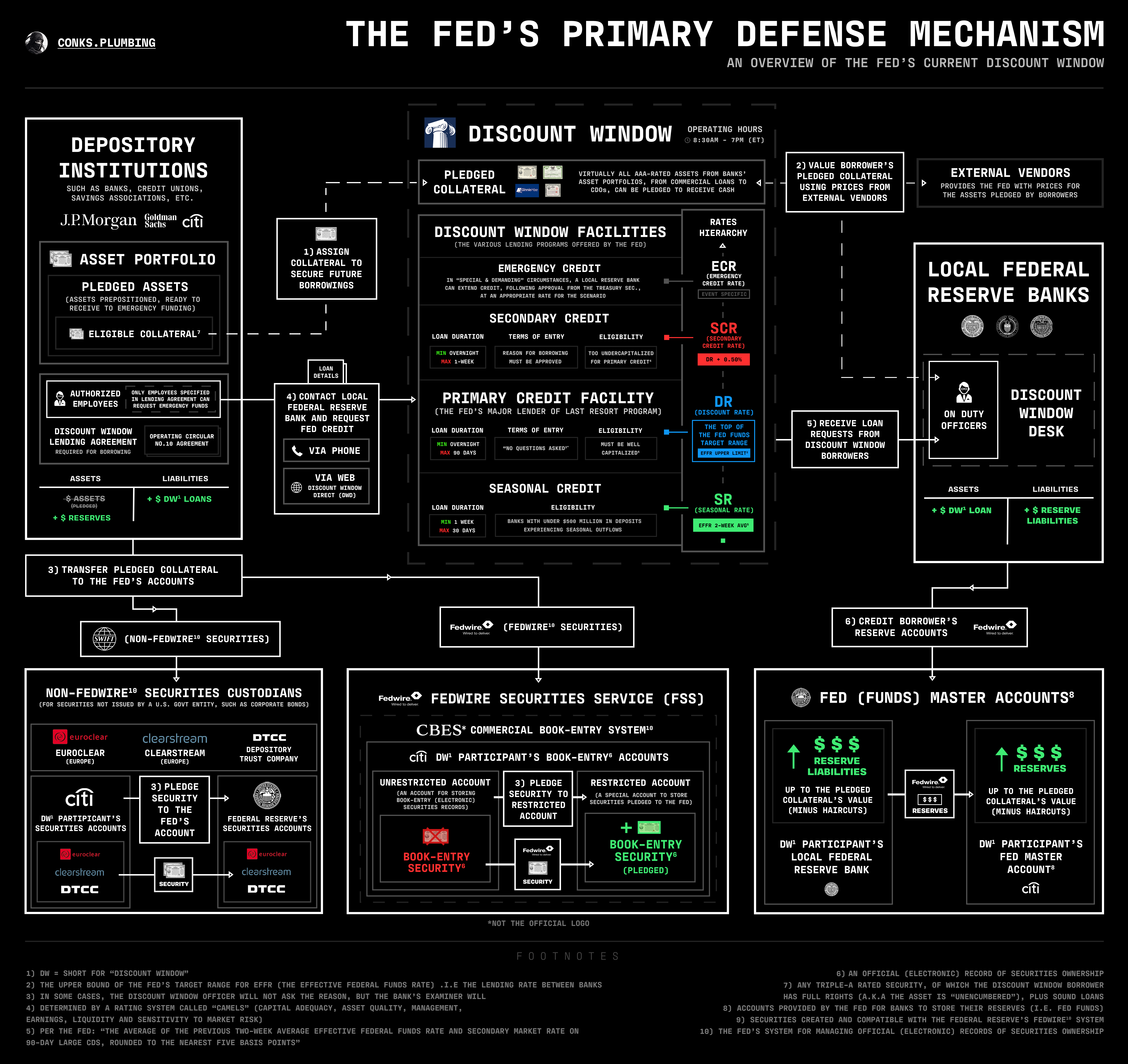 Acting as an onshore ceiling within the Fed’s global dollar rates hierarchy, the Discount Window has enabled the U.S. central bank to deliver endless liquidity to America’s banking colossus, all while deterring its benchmark interest rate, Federal Funds (EFFR), i.e. the interbank market rate to borrow reserves, from breaching officials’ target boundaries. Though imperfect, the Discount Window has averted most interbank squeezes by supplying reserves via numerous facilities, each with differing terms of entry. The most prominent and accessible by far, however, remains the Primary Credit Facility, or PCF for short. Serving as the Fed’s official rescue mechanism, the PCF provides almost all Discount Window loans to ostensibly sound banks desperate for reserves, which they use to try to stay in business during fierce outflows. The PCF relieves the pressure of heavy withdrawals, where too many depositors transfer their cash to other banks, usually in times of turmoil. Instead of “firesaling” assets (selling securities at a loss) to raise the reserves needed to process outflows, solvent yet illiquid banks can pledge virtually any triple-A rated asset to the U.S. central bank — from Treasuries to foreign currency bonds to CDOs — in exchange for emergency dollars.
